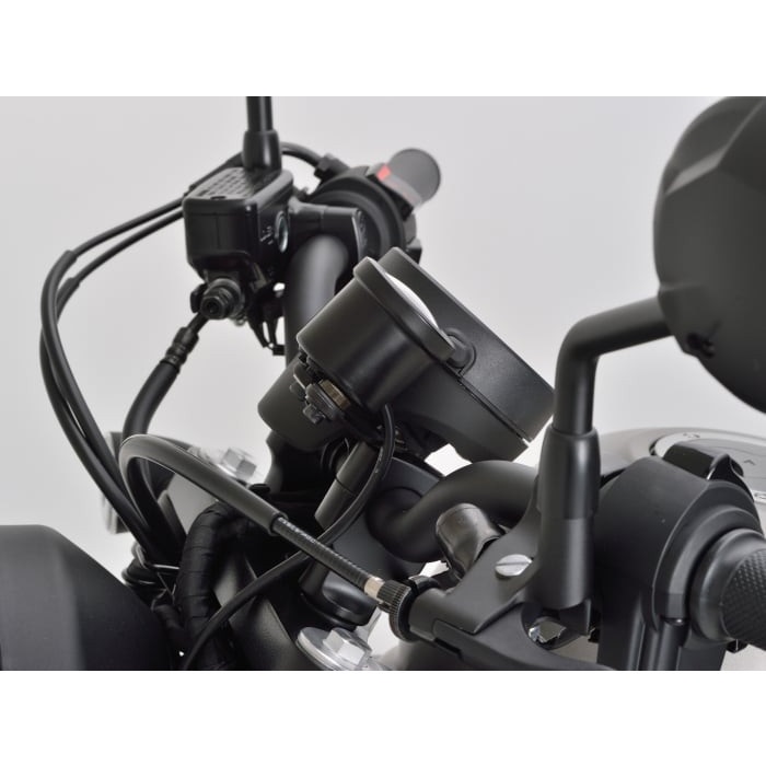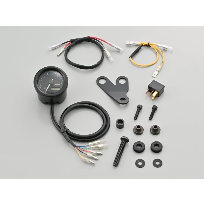ブラックボディのVELONA Φ48 タコメーターキット。ボルトオンで純正スピードメーター横にバランス良く配置できます。メーターは常用回転域で見やすい9000rpm表示。メーターステーは振動対策のためラバーマウントを採用しています。