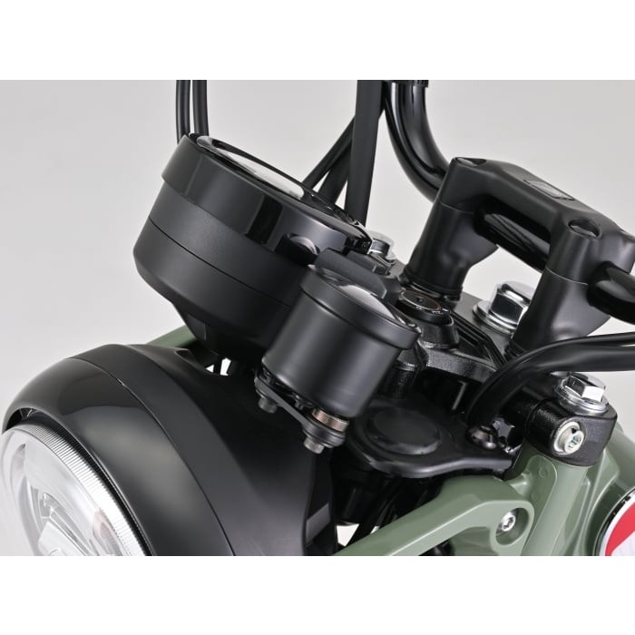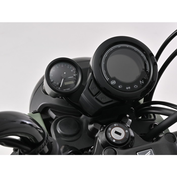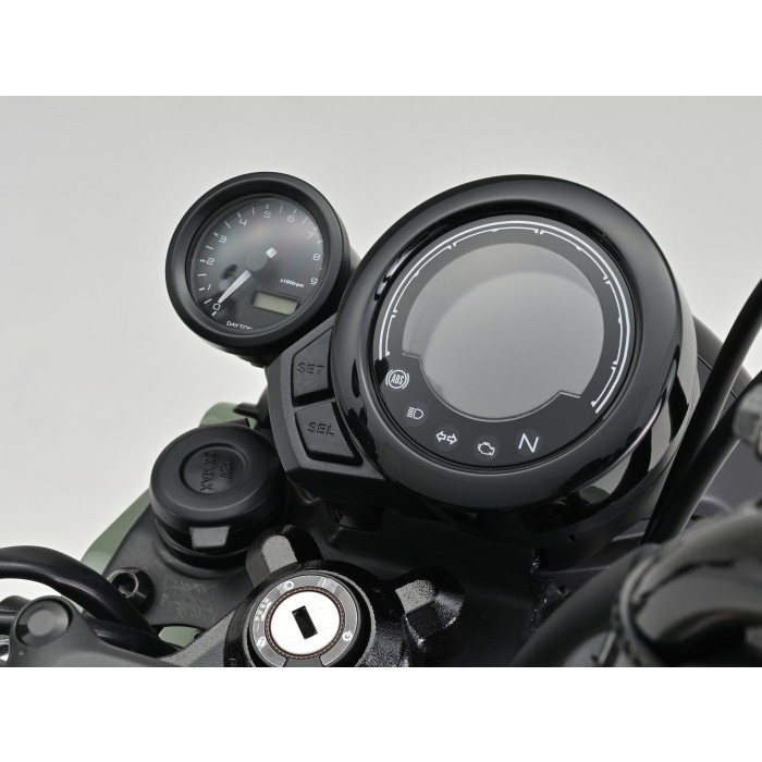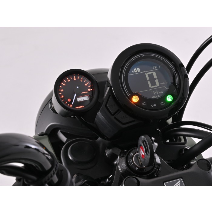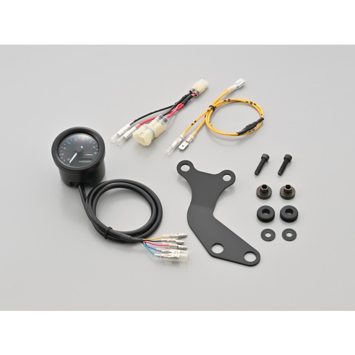 純正スピードメーターの左側に VELONAΦ48タコメーターを装着できるボルトオンキット。実用回転域にマッチした9000rpm表示 (ブラックボディ/ブラックパネル) 。取付ステーはメーターへの振動を軽減するラバーマウント式です。