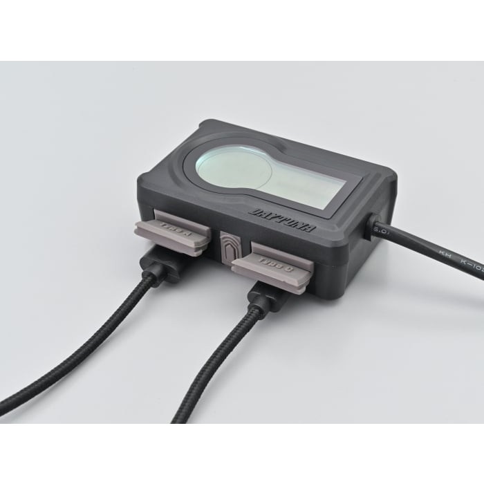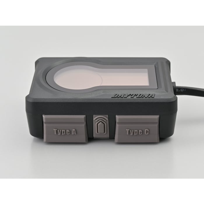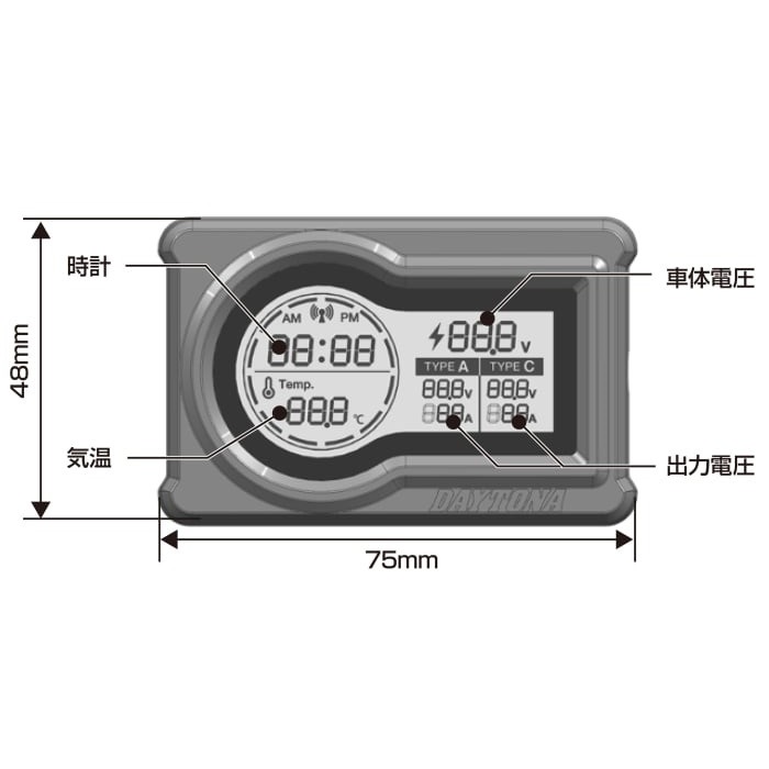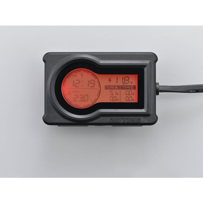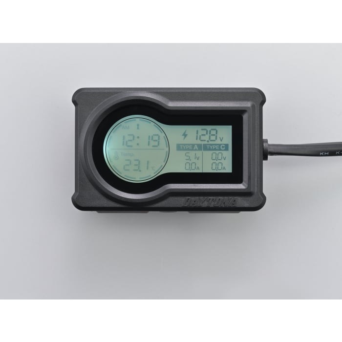 電波時計/気温/入力電圧/出力電圧電流を常に表示。電圧低下(11.8V以下)やスマホへの充電状況がわかる。