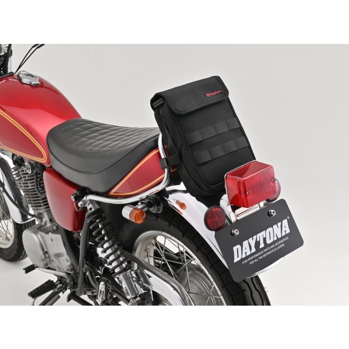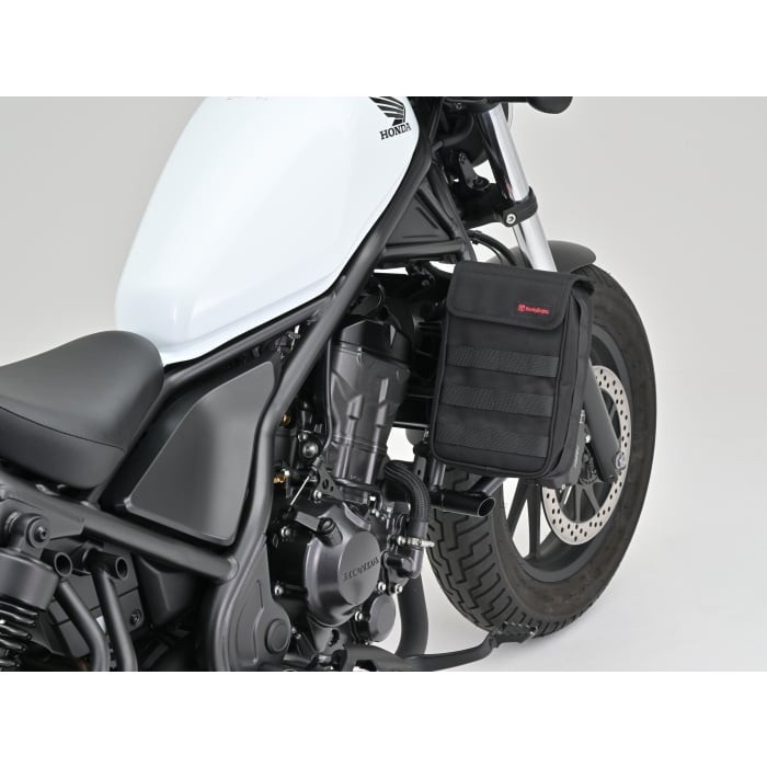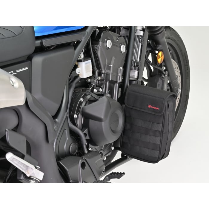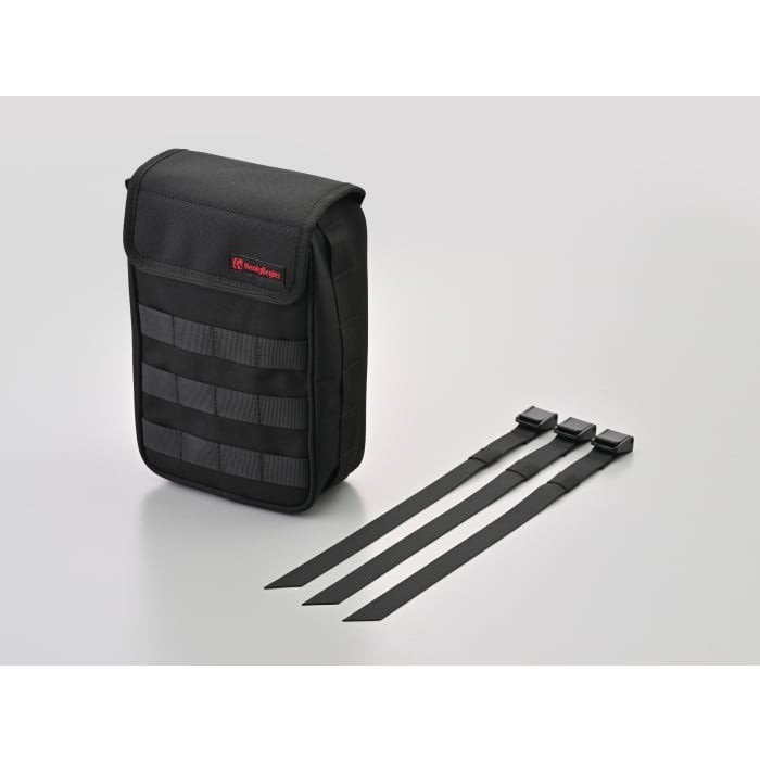 生地にはタフな「600D CORDURA」を採用しました。エンジンガードやグラブバー付近の装着にベストな縦長サイズ。車載工具やガソリン携行ボトル、パンク修理キット等の収納に最適。