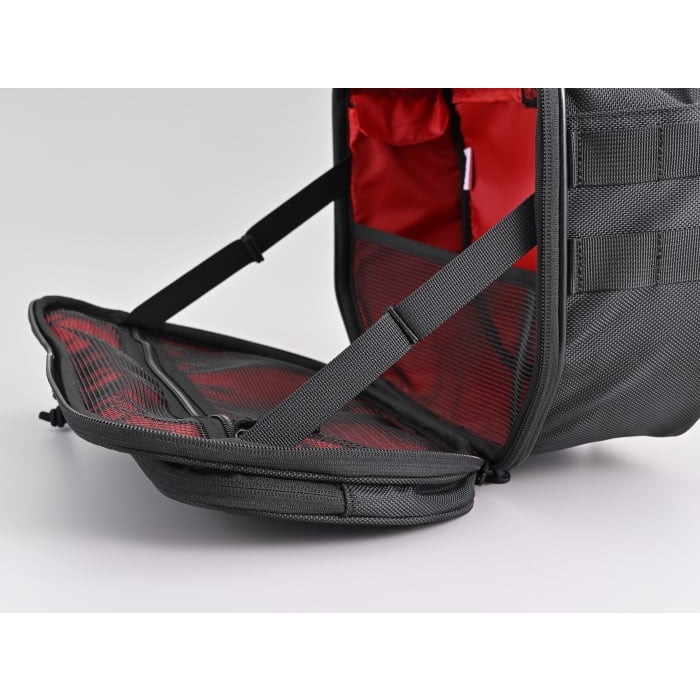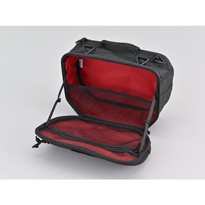 シートバッグ装着時でも荷物を取出しやすい横開きの蓋には、開き切らないストッパーや荷物がこぼれないネットが付いています。