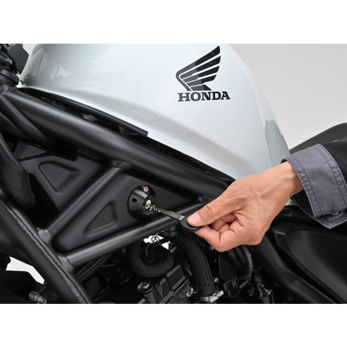 純正のキーシリンダーは横向きのため乗車状態でキー穴が見えず、カギ先でキーシリンダ上面を傷だらけにする上、キーカバーはゴム製のため経年劣化すると茶色く変色してしまいます。キー挿込口がテーパー状の本商品を装着することで、カギ穴にカギを挿し込みやすくなり、アルミ製ブラックアルマイト仕上げのボディは美しさを長く保ちます。