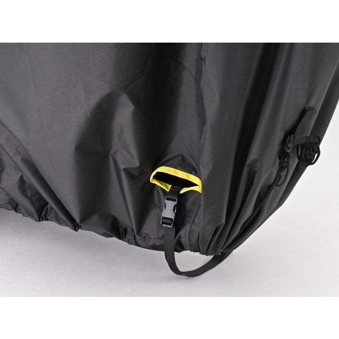 サブベルトと後部のひも締めでカバーが風で飛んでいく心配がありません。ベルト2本は自由に固定が可能。前後のタイヤに固定したり、2本を1つに繋げて固定することができます。