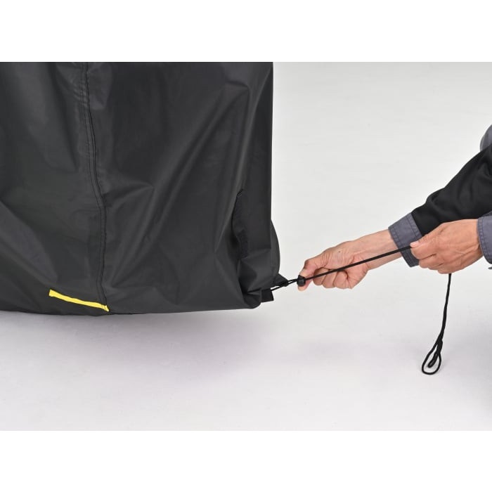 4) バックル (メス) を離して、ファスナーを締め、絞りひもを引っ張る。必要に応じバックルでカバーを締め、最後にロックなどの防犯対策を行なう。