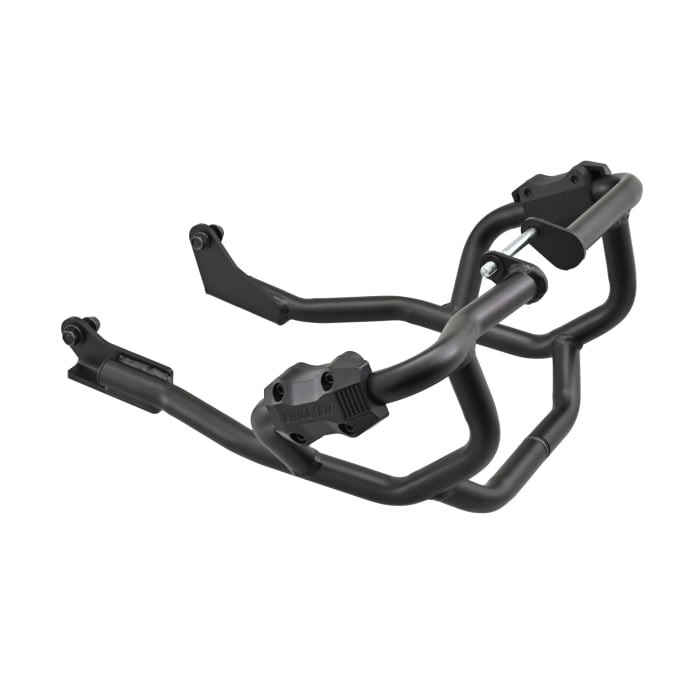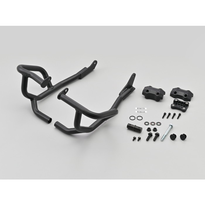 不慮の転倒の際、ライダーや愛車へのダメージを軽減させるエンジンガード。マフラーの脱着が不要で取り付けができます。