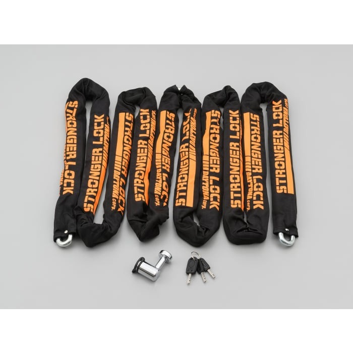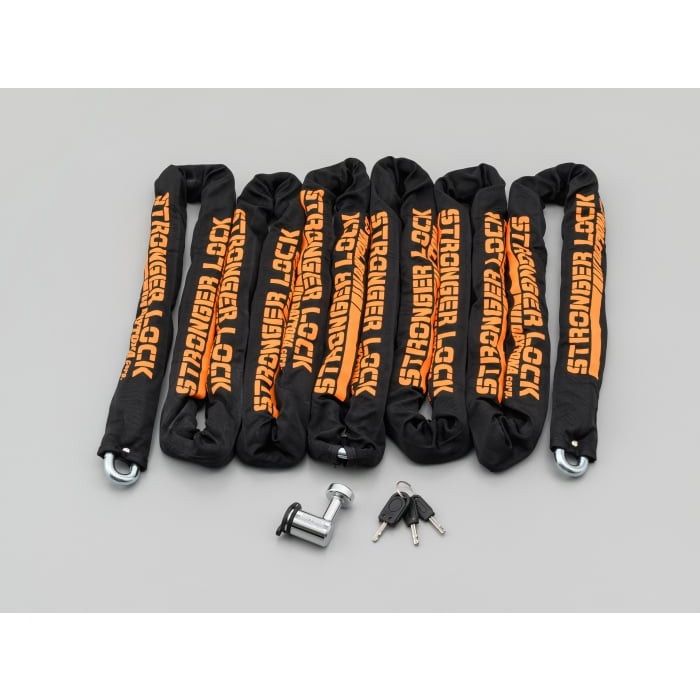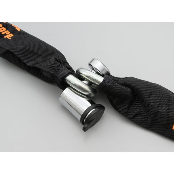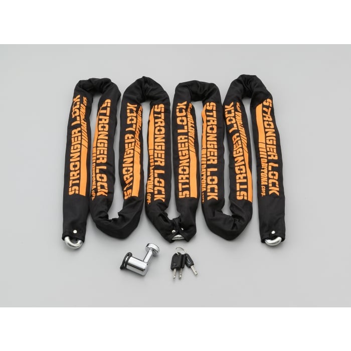 焼き入れ加工済みのスチール合金製チェーン。ノコギリやカッター、ハンマーなどによる破壊に強く、愛車を盗難から守ります。バイク1台分をロックしたいときに、もたつかず使いやすい長さに設定しました。ロック部は持ち運びできるよう、ディスクロックを使用。