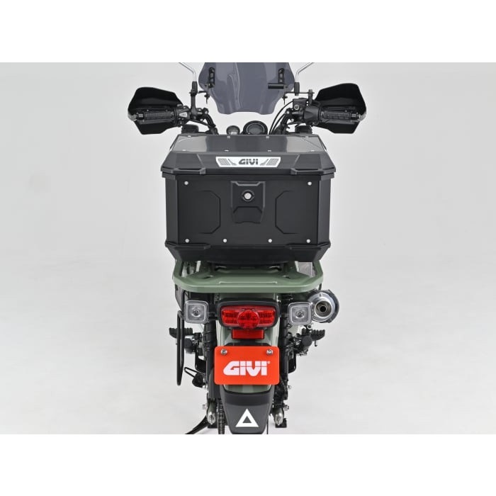 ベースからの脱着はボックス内側から操作するので防犯性が高い構造です。上下に4カ所ずつベルトループを備え、シートバッグなどをフタの上に積載できます。モノロック用のWIDE汎用ベース付属。