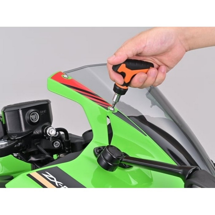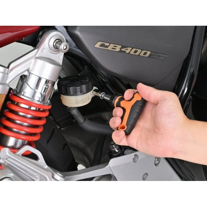 狭いスペースでも作業しやすい手のひらサイズのミニラチェットTハンドルと、六角ソケット、10種類のビットなどを組み合わせたツールセット。六角ソケットは、ミリサイズ、インチサイズ各7種類の複合セットです。全長60mmの磁気付きエクステンションバーも付属するので、奥まった場所の作業も可能です。