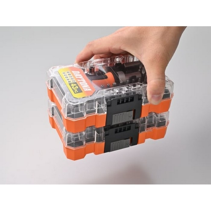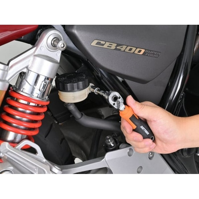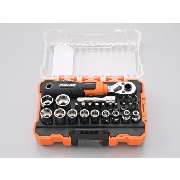 差し込み角1/4インチ(6.35mm角)のラチェットハンドルと、11サイズの六角ソケット(4?14mm)、マイナス・プラス・トルクスビットなどを組み合わせた、コンパクトなツールセット。ソケットエクステンションバー(50mm)も付属し、奥まった場所での作業も可能です。