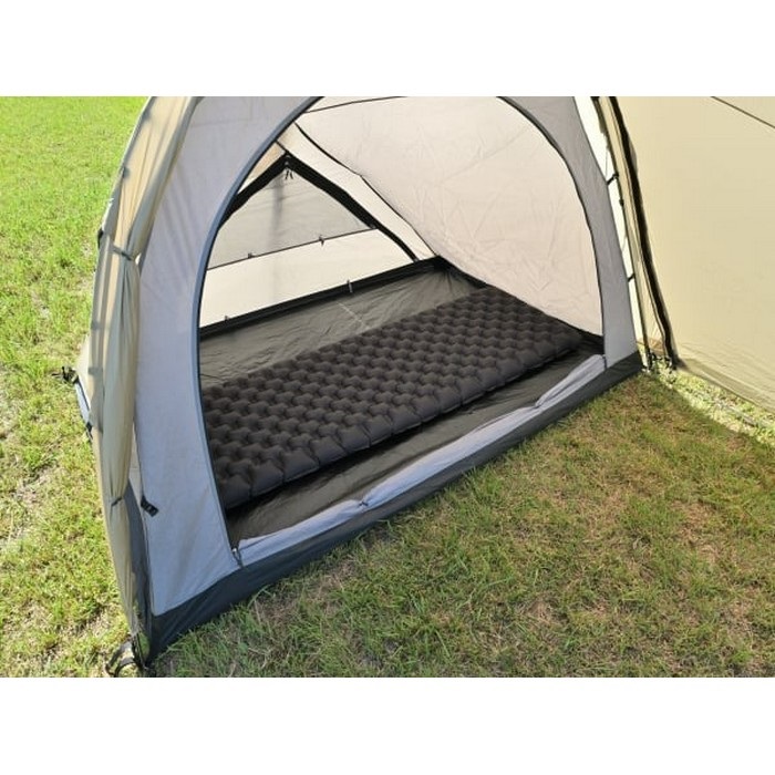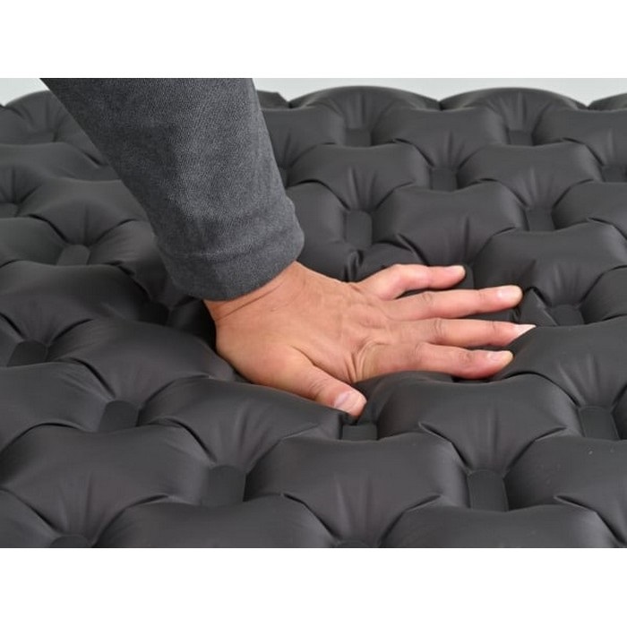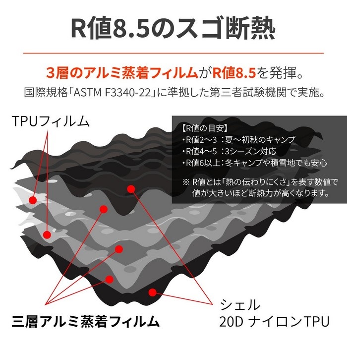 驚異の【R値8.5】超断熱エアマット。三層の両面アルミ蒸着フィルムをTPUフィルムで重ねることで、高い断熱性を実現。10cmの厚みで地面の凹凸も、シートの段差も感じさせない。幅64×193cm、ゆとりのサイズで快適な眠りをサポートします。収納時はΦ11×33cmとコンパクトで邪魔にならないサイズです。
