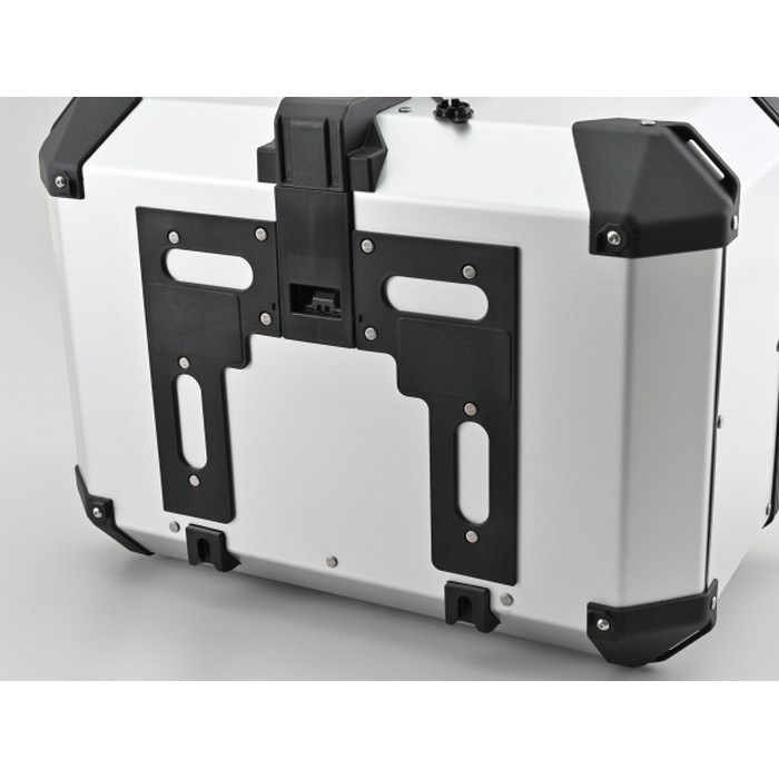 1.5mm厚のアルミプレートとテクノポリマーパーツを組み合わせた堅牢な構造に、大型の荷掛けフックやARHS(上蓋開口調整システム)を装備。トリプル装着時に同じカギへの交換が簡単な「スマートセキュリティロック」を採用。手あかや水あかなどの汚れが付きにくいアルマイト仕上げです。