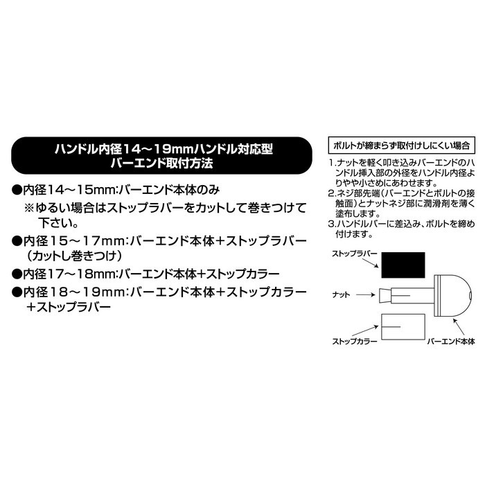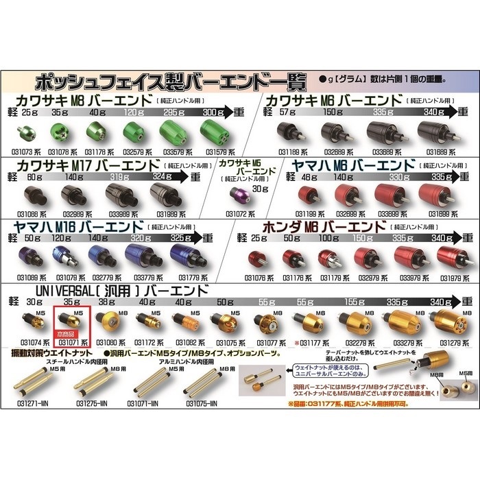 POSHFaith社が誇るスーパーバイクバー及びスチール、アルミのいずれかのバーハンドルにも対応すべく開発されたアルミ削り出しバーエンドは転倒の際にクラッチレバーやブレーキレバーの破損を極力サポートしつつ、ドレスアップとしても楽しんで頂けます。又、バーエンドがパイプのセンターに来る様、新設計されたニューモデルです。※ハンドル内径14-19mm、ほとんどのパイプハンドルに使用可能。※純正ハンドルなどに使用できないものがございます。ハンドル内径の確認が必要です。 ヘビーウェイトナットM5ナット用031071-WN(135g/PC)と併用することでバーエンドの重量を更にアップ、 不愉快な微振動を軽減します。 【サイズ】バーエンド外径:22.0mm(最大径) 【重量】1個あたり約34g ◆左右セット ◆アルミ削り出しアルマイト/メッキ仕上げ ◆日本製 対応車種