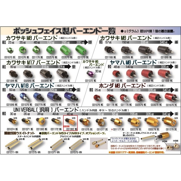 POSHFaith社が誇るスーパーバイクバー及びスチール、アルミのいずれかのバーハンドルにも対応すべく開発されたアルミ削り出しバーエンドは転倒の際にクラッチレバーやブレーキレバーの破損を極力サポートしつつ、ドレスアップとしても楽しんで頂けます。又、バーエンドがパイプのセンターに来る様、新設計されたニューモデルです。※ハンドル内径14-19mm、ほとんどのパイプハンドルに使用可能。※純正ハンドルなどに使用できないものがございます。ハンドル内径の確認が必要です。ヘビーウェイトナットM5ナット用031071-WN(135g/PC)と併用することでバーエンドの重量を更にアップ、不愉快な微振動を軽減します。 【サイズ】バーエンド外径:Φ22.0mm(最大径) 【重量】1個あたり約39g ◆左右セット 日本製 対応車種