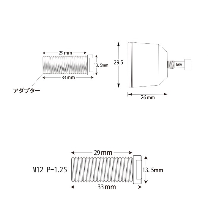 “シンプルなデザイン”ソリッドバーエンド!スズキ車純正M12-P1.25 バーエンド穴に適合(純正ハンドルバー用)【素材/材質】アルミ削り出しアルマイト/メッキ仕上げ 【重量】 1個あたり47g 【付属品】 スズキ車専用M12アダプター:2個 ステンレスキャップボルトM6X35:2本 【仕様】 最大外径:29.5mm 左右セット 日本製 ※使用するグリップ・車種によってはワッシャー等で調整が必要な場合があります。 ※車体によっては付属のボルトでは不十分な可能性も考えられますので予めご了承ください。 ※取り付けの際、脱落防止の為、ネジロック剤の塗布を推奨致します。 対応車種