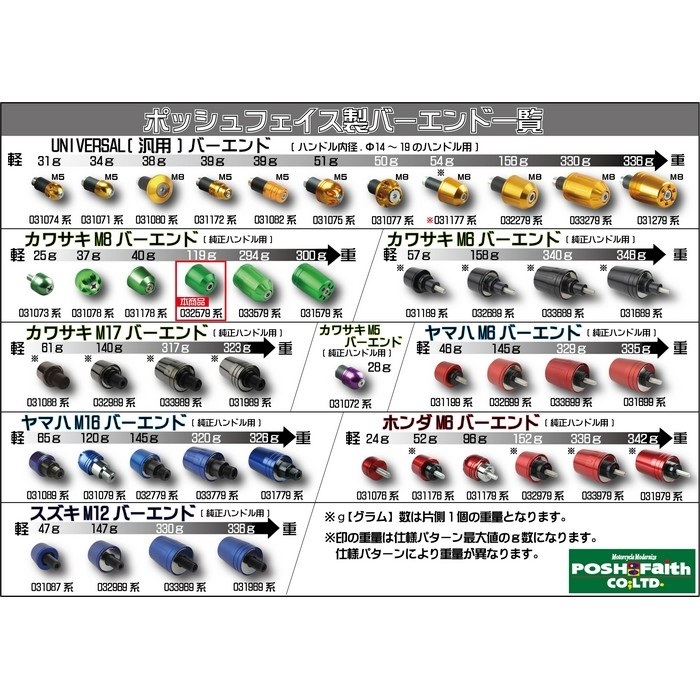 “ちょい重”ミドルウェイトバーエンド!カワサキ車純正M8バーエンド穴に適合(純正ハンドルバー用)2重構造、内側に防錆処理を施した真鍮ウェイト、外側にアルミカバーを採用することで機能性と美観を両立。カラーバリエーションも豊富に全17色展開、つや消しやメッキも設定あり好みや車体色に合わせてカラーをお選びいただけます。日本製でハイクオリティな仕上がりになっています。 【素材/材質】 インナー:真鍮メッキ仕上げ アウター:アルミアルマイト仕上げ 【重量】 1個あたり約119g 【仕様】 ・防振ウェイトバランサータイプ ・最大外径:34.5mm ・全長:30mm ・日本製 ※使用するグリップ・車種によってはワッシャー等で調整が必要な場合があります。 ※車体によっては付属のボルトでは不十分な可能性も考えられますので予めご了承ください。 ※取り付けの際、脱落防止の為、ネジロック剤の塗布を推奨致します。 対応車種