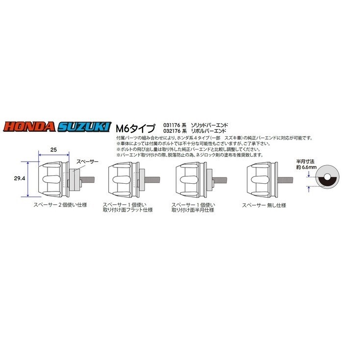 付属パーツの組み合わせにより、ホンダ、スズキ車の純正バーエンドに対応が可能です。