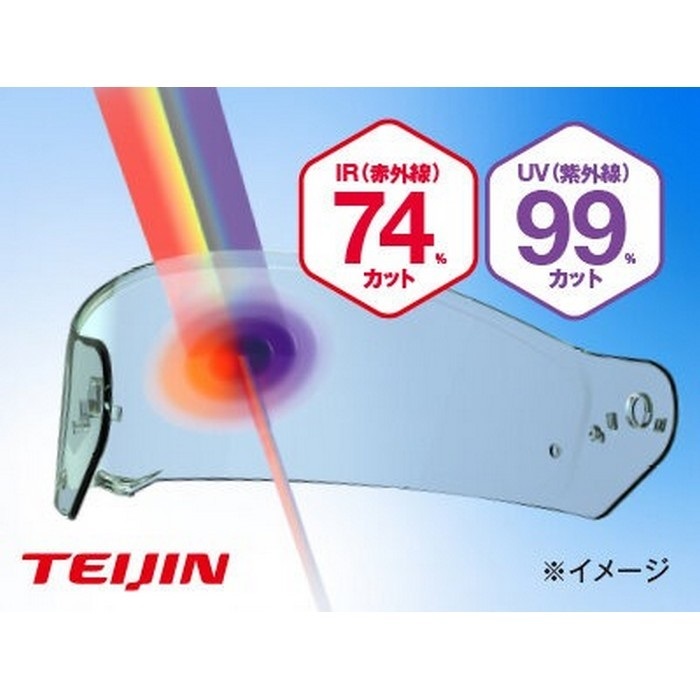 UV(紫外線)とIR(赤外線)をカットする、帝人株式会社の高機能ポリカーボネートをシールド素材として用いた『UV&IRカットシールド』を採用。太陽光の赤外線(IR)で発生する日射熱による温度上昇を抑制する熱線遮蔽性能があり、ヘルメット用シールドでは最も重要な「クリアな視認性」を保ったまま、ヘルメット内部への熱伝導を低減させます。