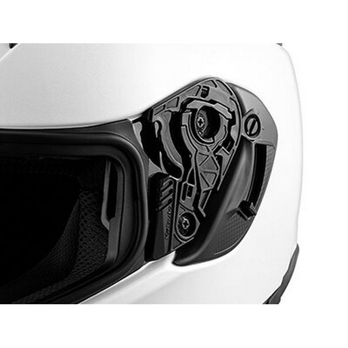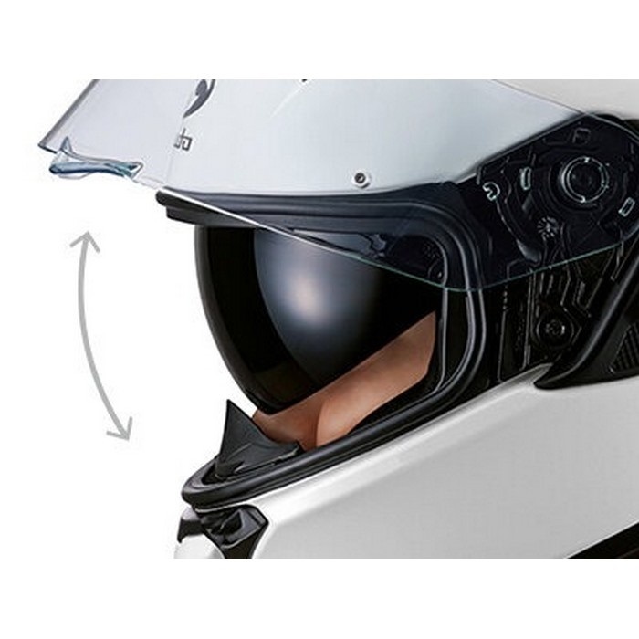 シールド開口部を拡大した新設計を採用し、インナーサンシェードを大型化、2段階の高さ調整も可能に。これまでにない開放的なライディングフィールをもたらすとともに、走行中の状況把握がしやすくなることで安心感とトラブルへの回避能力を高めます。シールドは新設計の二軸シールドラチェット構造とロック機構により、歪みを抑えつつ密着性と静粛性を向上させ、よりクリアな視界を実現しました。