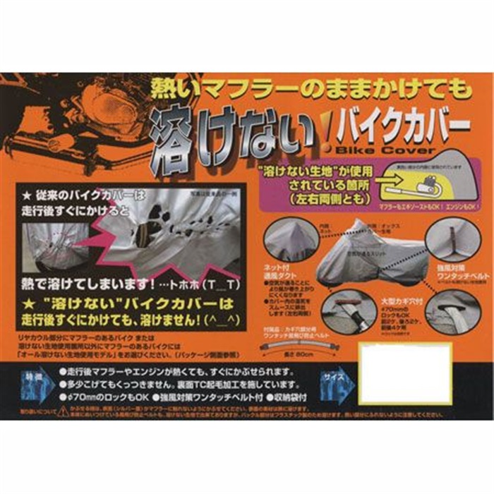 ※カバーを車体にかぶせる際には、表面(シルバー面)は溶けてしまう素材の為、マフラーなどの高温部分に触れないようにして下さい。