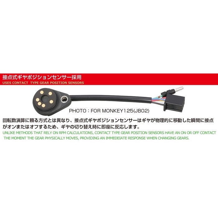 ○ギヤポジションインジケーター:接点式ギヤポジションセンサーにより、1速~最大5速までの表示が可能。瞬時に何速に入っているかを表示します。