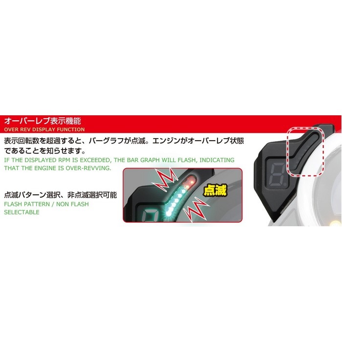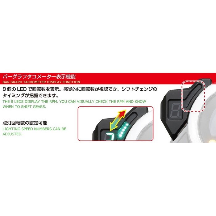 ギヤポジションインジケーターに加え、8 個のLED を使用したLEDバーグラフタコメーターとシフトアップインジケーターを組み合わせた、純正スピードメーターに違和感なく装着できる多機能インジケーター。