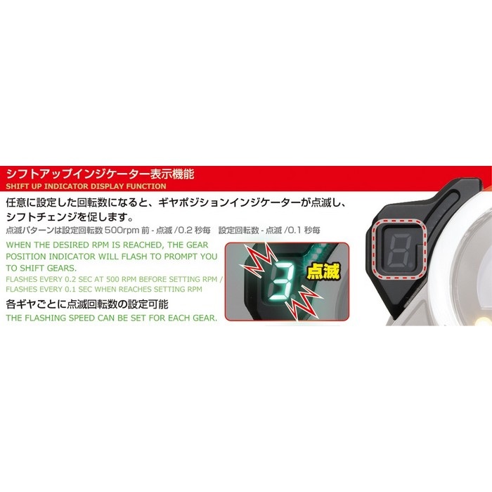 ○シフトアップインジケーター点滅設定:ギヤポジションインジケーターの点滅回転数を各ギヤごとに設定可能。