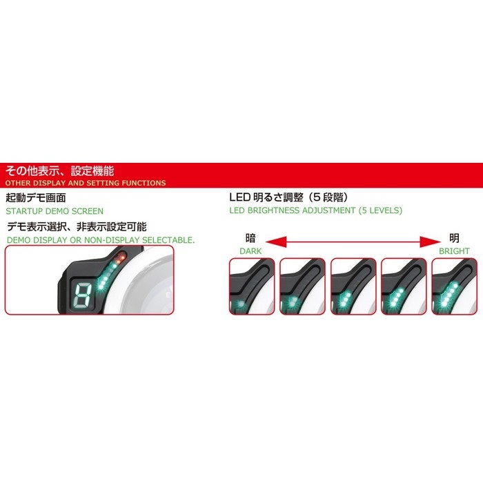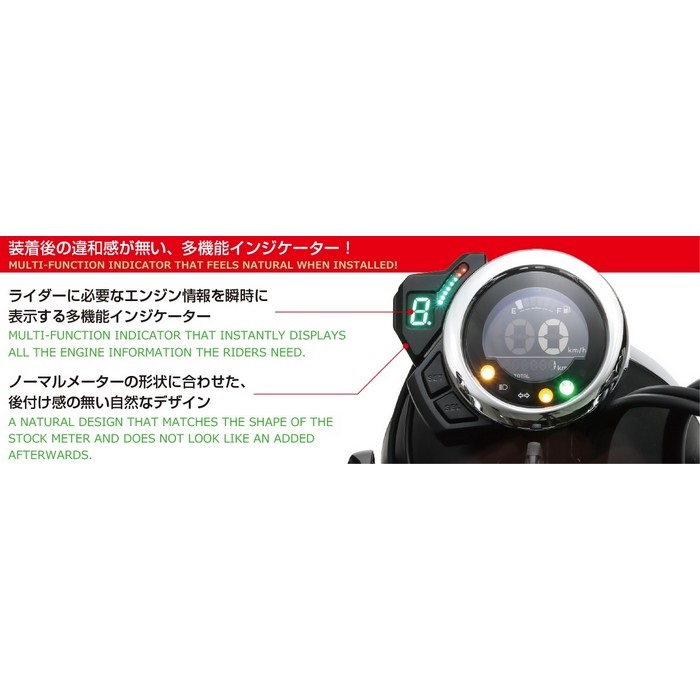 ギヤポジションインジケーターに加え、8 個のLED を使用したLEDバーグラフタコメーターとシフトアップインジケーターを組み合わせた、純正スピードメーターに違和感なく装着できる多機能インジケーター。