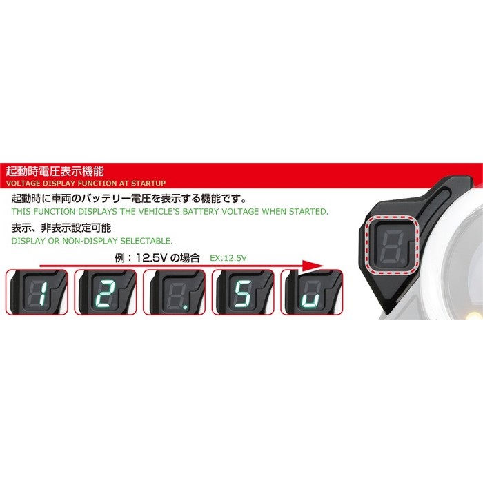 ○起動時電圧表示機能:起動時に車両電圧を表示する機能です。