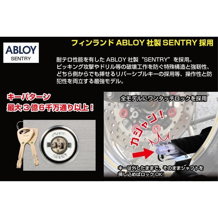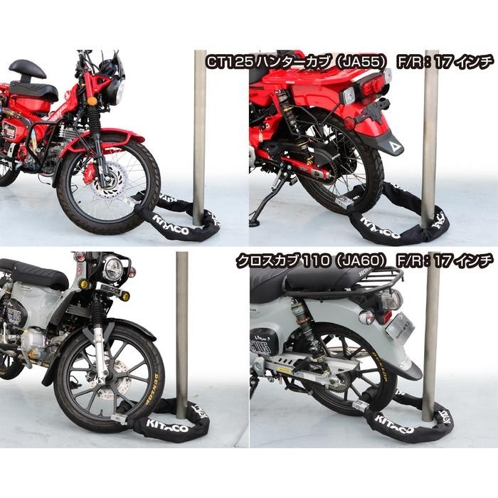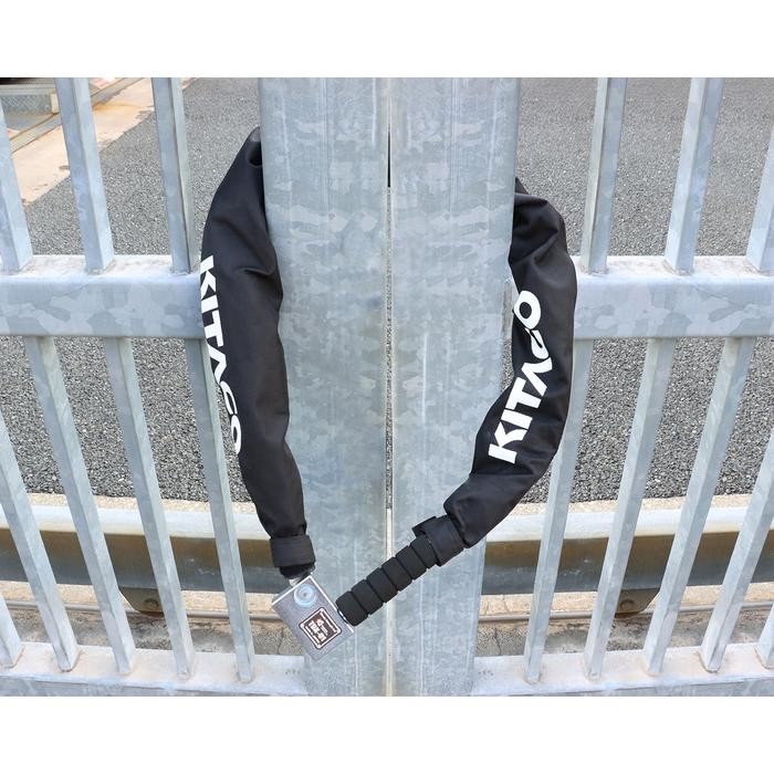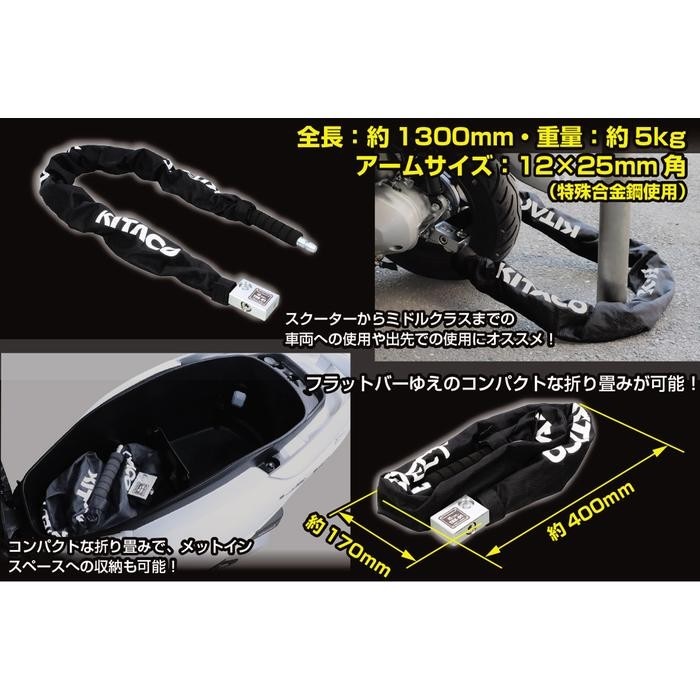 フラットバージョイント構造によりコンパクトに折り畳め、スクーターのメットインにもすっきり収納可能。門柱ロックにも最適な設計です。