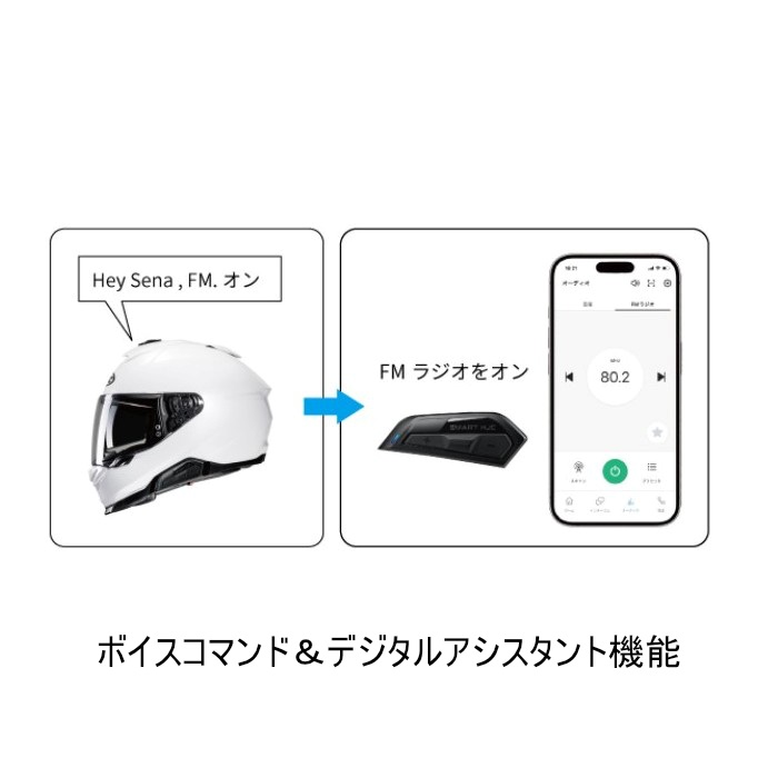 電源を入れて「Hey Sena」とマイクに向かって話しかけるだけで、ボイスコマンドが起動、バッテリー残量チェックや音楽の再生・一時停止、着信応答など、さまざまな機能を操作できます。 また、SiriやGoogleなどのデジタルアシスタントにも対応。走行中マイクに向かって「Hey Siri」「OK Google」など話しかけることで、声でスマートフォンの操作も可能です。