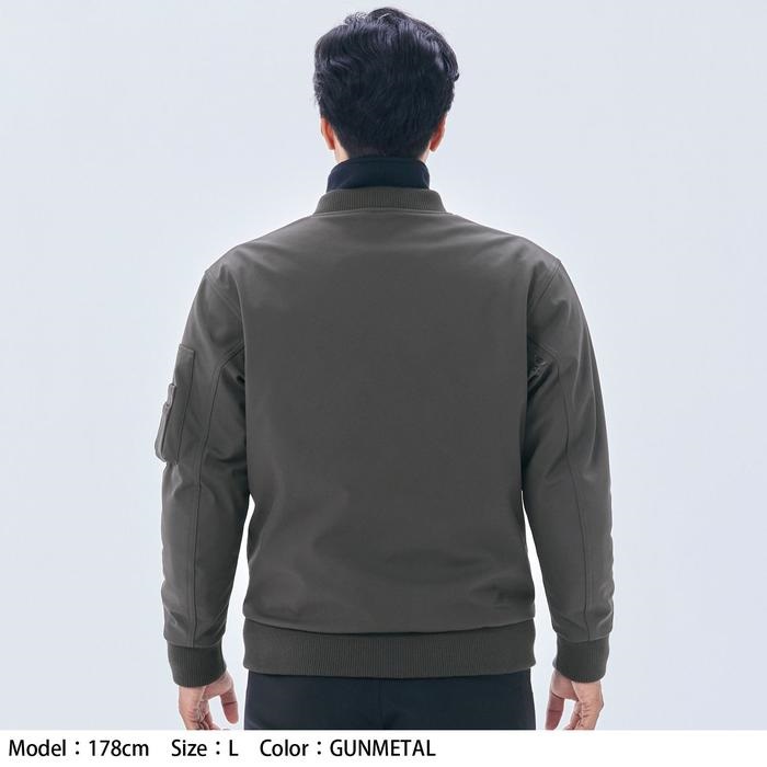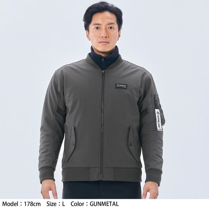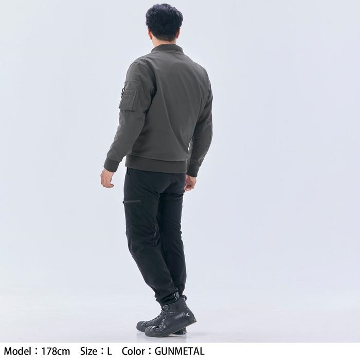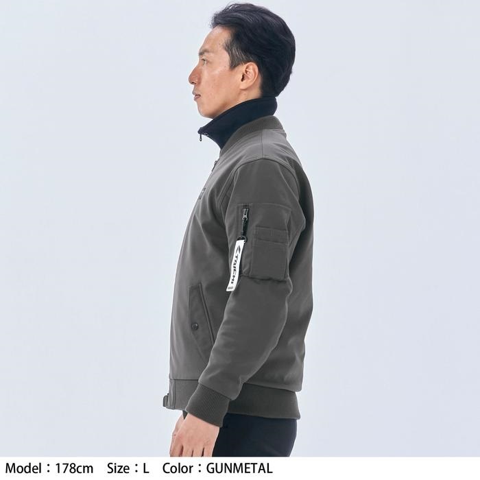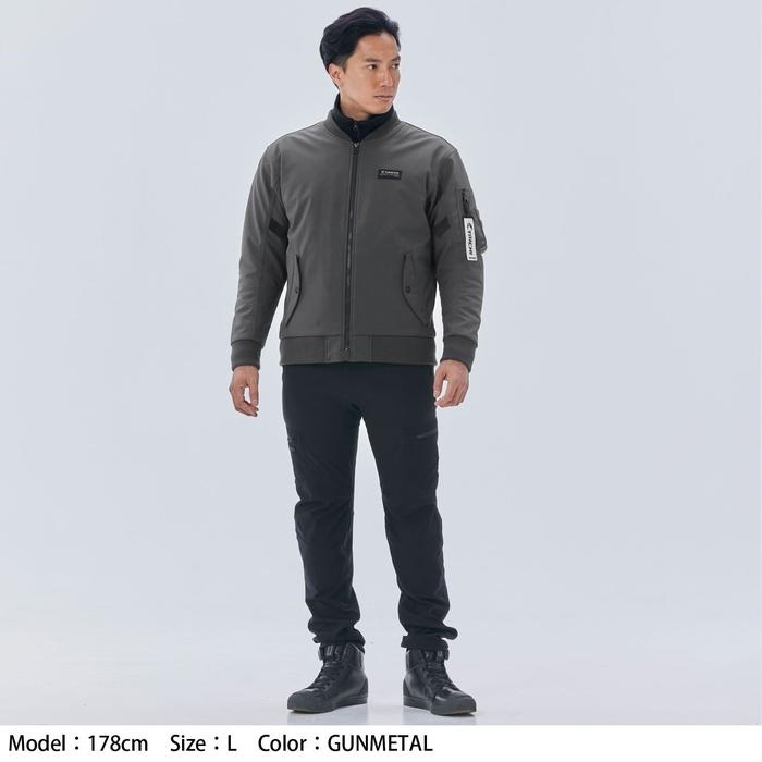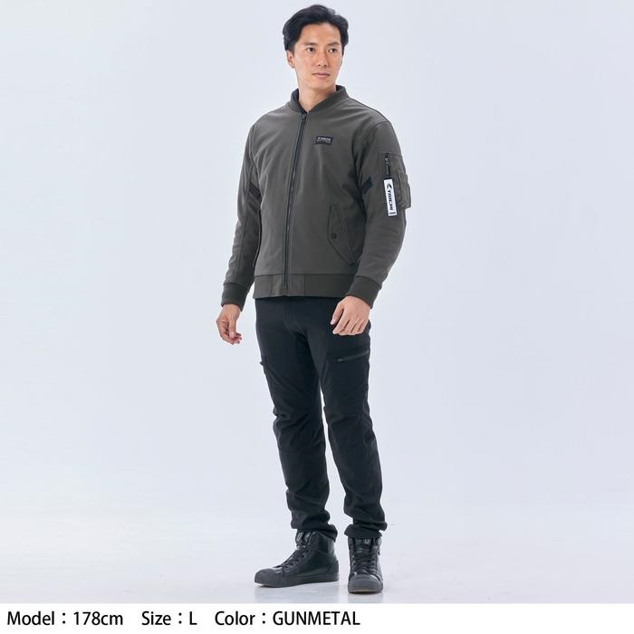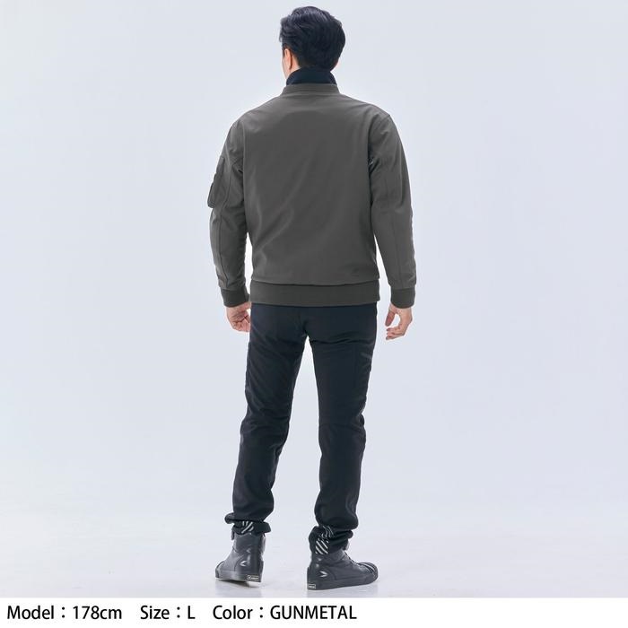 定番のMA-1スタイルを防風性やストレッチ性をもつソフトシェル生地で仕上げた、ミリタリーテイストのライディングジャケット。