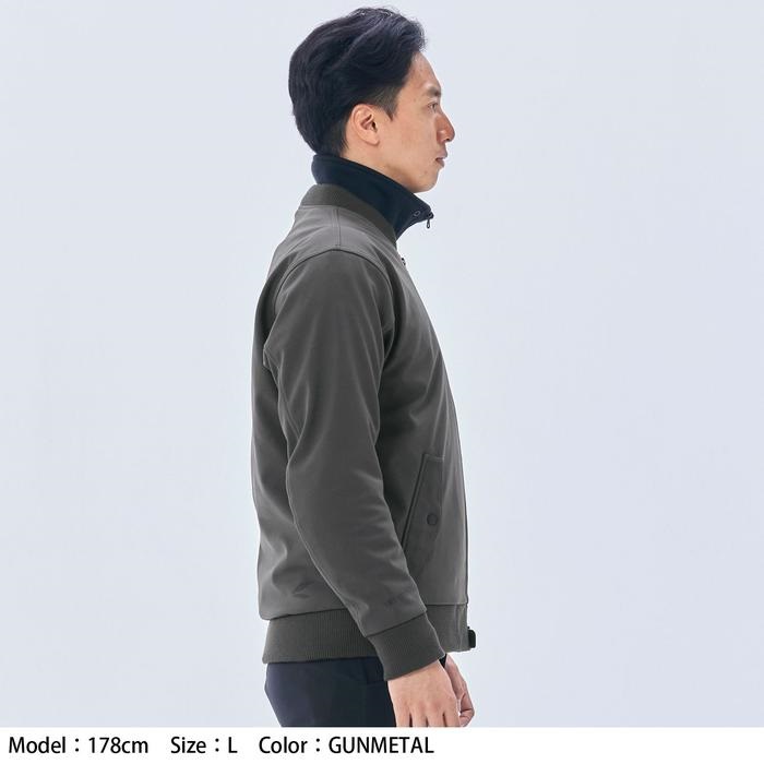 プロテクター内蔵のアウターと保温力をもつ中綿入りインナージャケットの二重構造で、気温やシーンに合わせてそれぞれ単体や組み合わせた着用が可能です。インナージャケットの首元リブには防風フィルムをインサートし、走行中はハイネックスタイルで風の侵入を抑え、降車後は襟を寝かせた着こなしで、それぞれ違ったスタイリングを楽しめます。