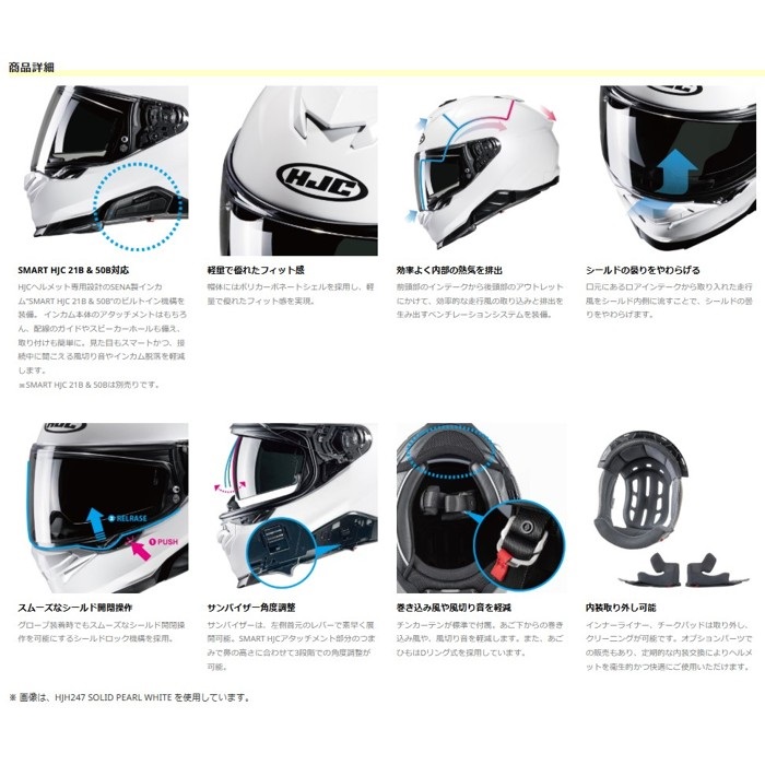 HJCヘルメット専用設計インカム“SMART HJC 21B & 50B”(別売り)のビルトイン機構を装備し、インカム装着時もヘルメットのデザインや空力性能を妨げることなくツーリングを楽しめます。