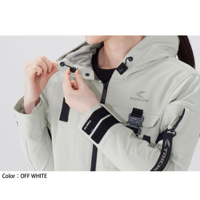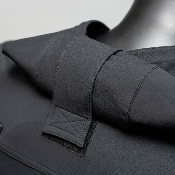 フードを使用しない場合には、巻き込んでベルクロにて固定することでバタつきを軽減。・内ポケットを装備