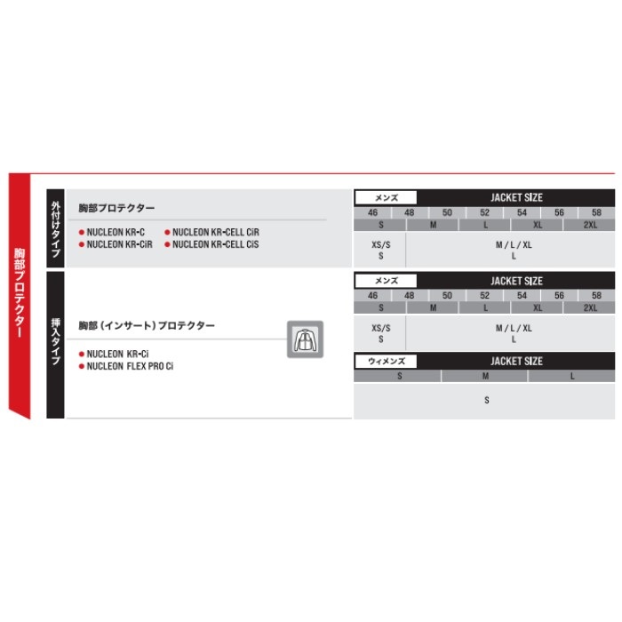 ※ジャケットによって適合プロテクター、適合サイズが異なりますのでご注意ください。詳しくはカタログに掲載しております。