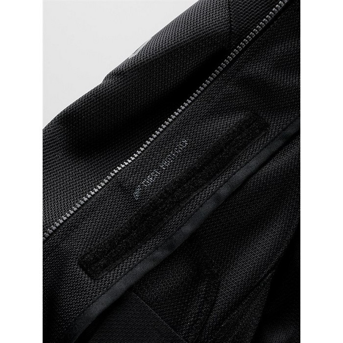 肩と肘には新設計の薄く柔らかなエアースルー構造のD3O Diabloプロテクター、背中にはD3O VIPER AIR(どちらもCE規格・LEVEL1認証)を採用しています。袖内側のスナップボタンで、EVOKEシリーズのインサレーションウエアとの連結が可能。襟まわりは低めのスタンドネック仕様。チェストプロテクターを装着するためのアタッチメントも装備しています。
