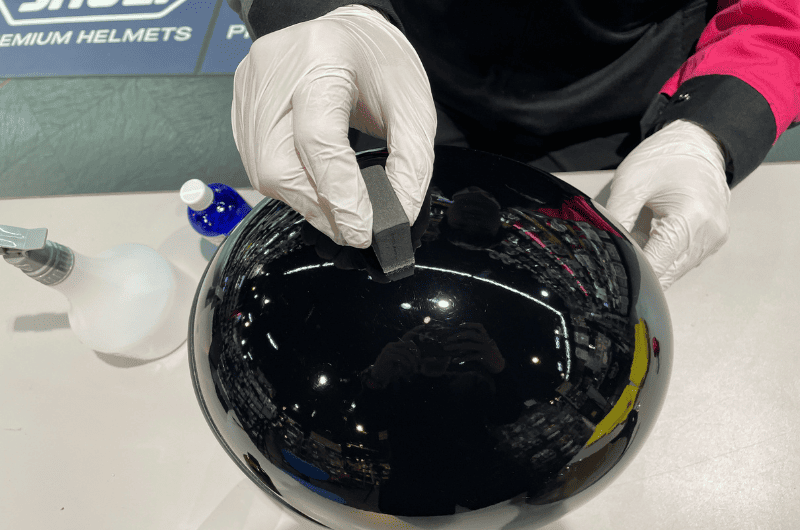 ②お客様の持ち込みヘルメットの場合は研磨し、しっかり脱脂をしてベースを整える。