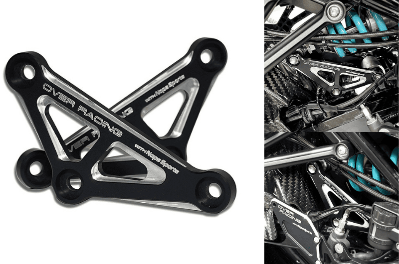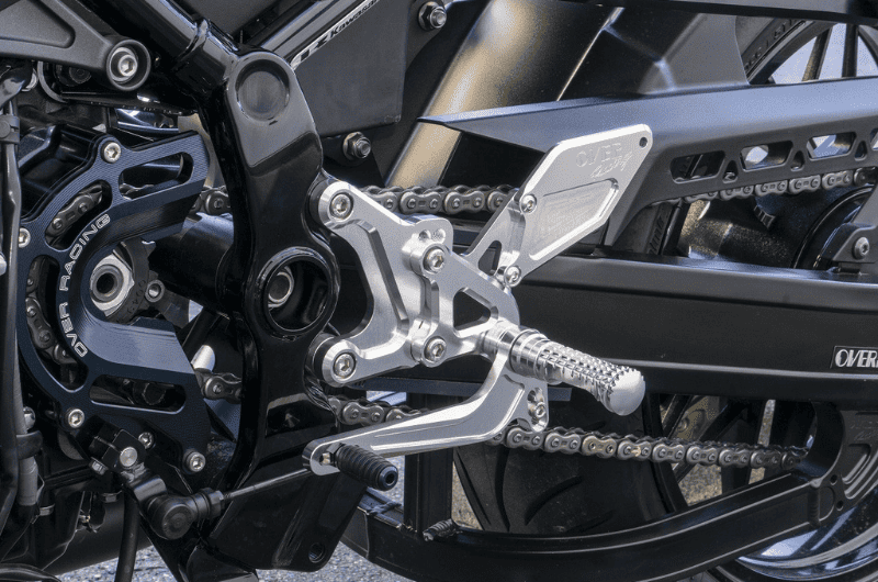 OVER Racingを代表するパーツのひとつがバックステップです。高精度なアルミ削り出しによって剛性と軽量性を高次元で両立しており、ステップ操作時のダイレクト感が大きく向上します。ポジションはスポーツ走行を意識しつつも、ストリートでの扱いやすさにも配慮されているため、サーキット志向のライダーだけでなく、ワインディングを楽しみたい方にも適しています。操作感の変化を最も体感しやすいパーツのひとつです。