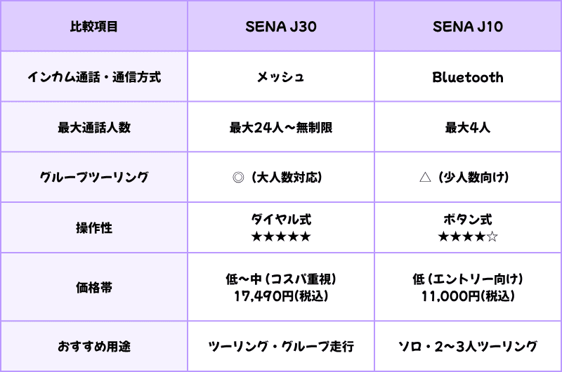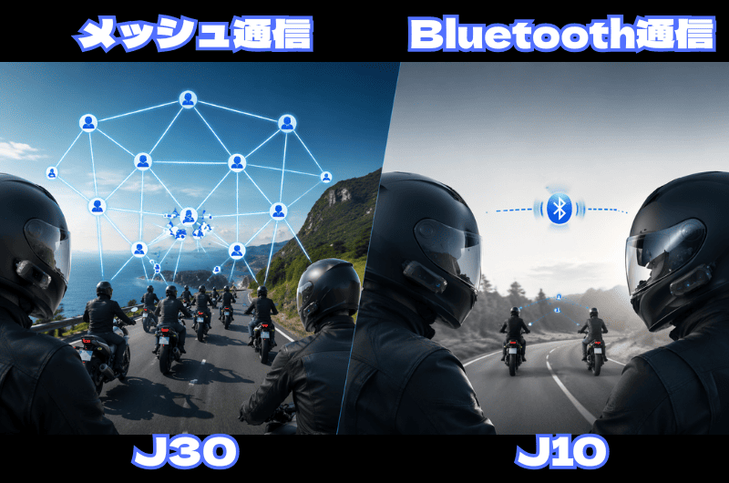 つまり、仲間と頻繁にツーリングに行く人や大人数で走る機会があるならJ30、ソロや少人数での使用がメインならJ10が適しています。通信方式の違いは、使い勝手に直結する重要な要素です。