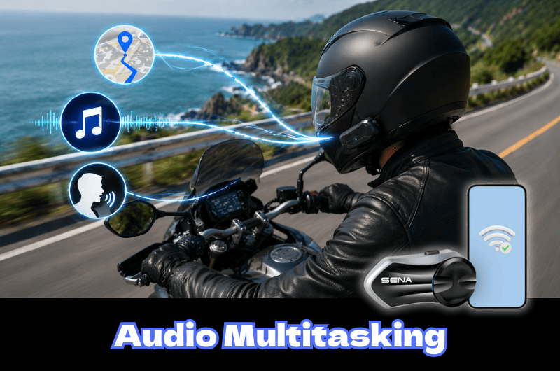 SENA J30とJ10はどちらもAudio Multitasking機能に対応しており、音楽・ナビ・通話を同時に扱うことが可能です。そのため、基本的な使い方であればどちらを選んでも快適に利用できます。