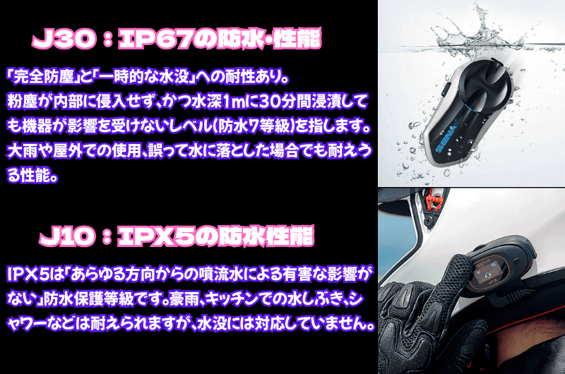どちらも防水性能としては高水準ですが、より過酷な環境や長距離ツーリングを想定するならJ30、街乗りや一般的なツーリング用途であればJ10でも十分対応可能です。使用環境に合わせて選ぶことが、満足度の高い選択につながります。