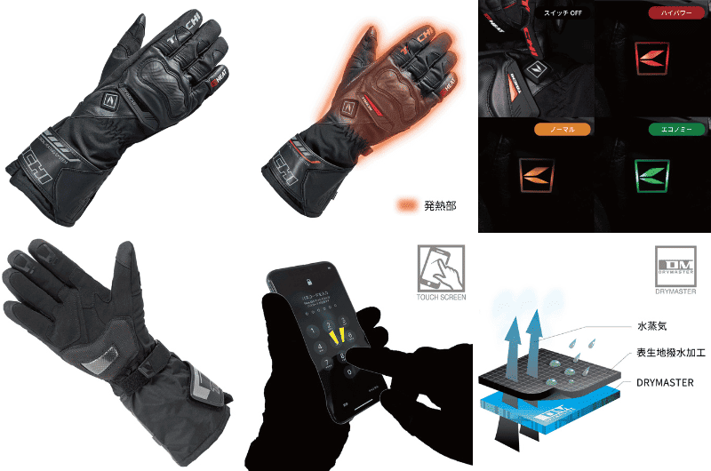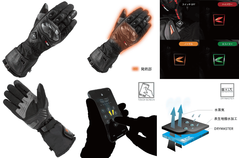 内部にはカーボンファイバー発熱ユニットを内蔵し、冷えやすい指まわりと甲をバランス良く加熱。発熱レベルは3段階切替式インジケータースイッチでワンタッチ操作が可能で、発光色によって温度設定やバッテリー残量を視覚的に確認できます。外装には防水透湿素材DRYMASTERを採用し、雨や雪にも対応。天候を問わず快適なライディングをサポートします。